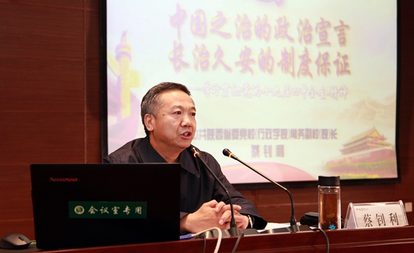 在“中国之治的政治宣言 长治久安的制度保证”主题报告中,蔡钊利从十九届四中全会的重大意义,中国特色社会主义制度和治理体系的显著优势,坚持和完善中国特色社会主义制度、推进国家治理体系和治理能力现代化的总体要求、总体目标、重点任务,认真学习贯彻十九届四中全会精神等方面,联系国家和陕西发展实际,对全会精神作了全面、系统、深入的阐述和解读。